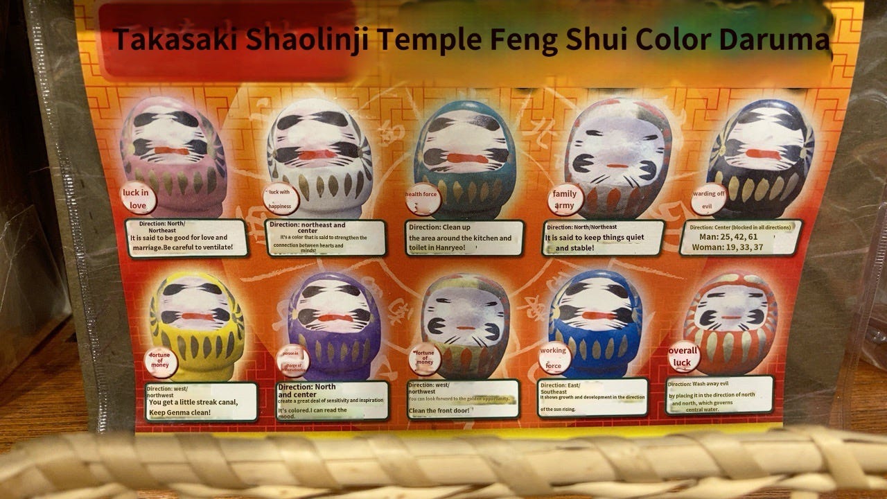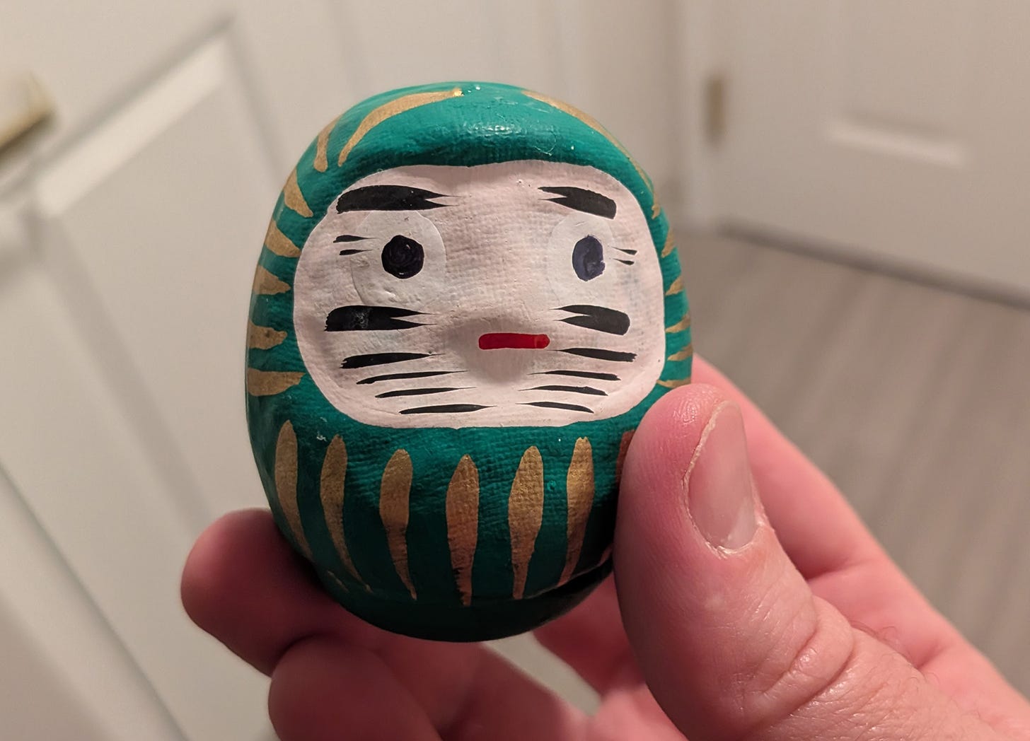 Unpacking her things, I found a Daruma doll I had forgotten about. This Japanese talisman is a gift that brings good luck, and they’re colored differently for different kinds of wishes.